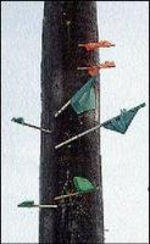 Flags of the Jamaica Labour Party and People's National Party are nailed to a palm tree in Buff Bay, Portland, on nomination day. - Andrew Smith/Photography Editor