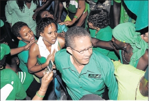 Jamaica Labour Party (JLP) leader Bruce Golding with supporters at his party's Mandeville rally, on Sunday, July 1. - Ian Allen/Staff Photographer
