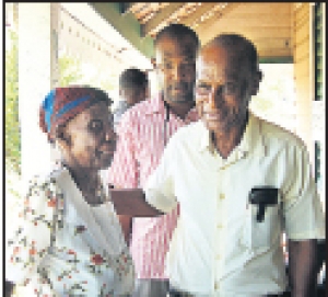 Evelyn Beckford (left) welcomes former Mayor of Savanna-la-Mar Ralph Anglin to her house which was used as a polling station. She said her house was built in1917 and has been used for several years as a polling station. In the background is PNP incumbent