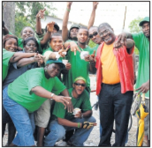 Milton Myles(second right), PNP Councillor/caretaker of south Savanna-la-Mar is outnumbered by JLP supporters. But it was all friendly bantering at the Savanna-la-Mar Primary School, on Election Day, yesterday.