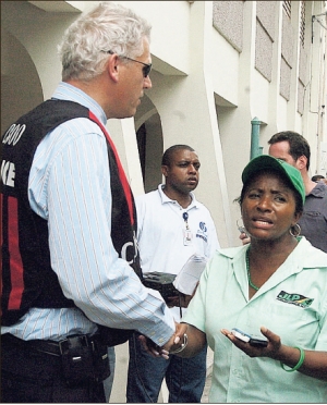 The Jamaica Labour Party's Joan Gordon-Webley in discussion with Deputy Commissioner of PoliceMark Shields, following a shooting on Deanery Road in South East St. Andrew, yesterday. - Junior Dowie/Staff Photographer