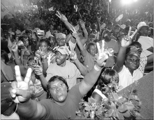 Jamaica Labour Party supporters celebrate wildly at party headquarters on Belmont Road, New Kingston, yesterday, after the JLP won 31 seats to the PNP's 29. - Ricardo Makyn/StaffPhotographer