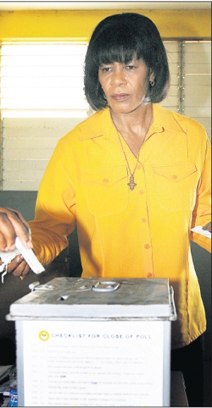Left: Jamaica Labour Party Leader Bruce Golding dips his finger in the ink after casting his vote at the Millsborough Avenue polling station in the East St. Andrew constituency yesterday. Right: Prime Minister Portia Simpson Miller casts her vote in Kingst